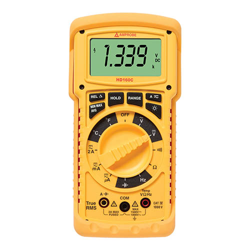 The Amprobe HD160C Heavy Duty Multimeter is designed for professional use in harsh environments. The HD160C is made using waterproof construction to prevent dirt, grime and moisture from entering the case and causing inaccurate readings or damaging shorts.