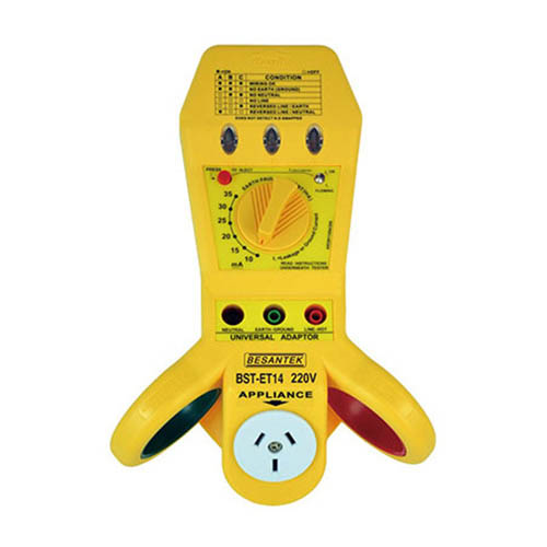 The BESANTEK BSTET14 Multi-Purpose Electrical Tester, ELCB, RCD, Wiring, Appliance Tester is designed for testing main wiring polarity check, line current testing, earth leakage testing, appliance testing (clamp meter required). This model features fused main adapter and appliances socket, as well as neon indicator lamps.