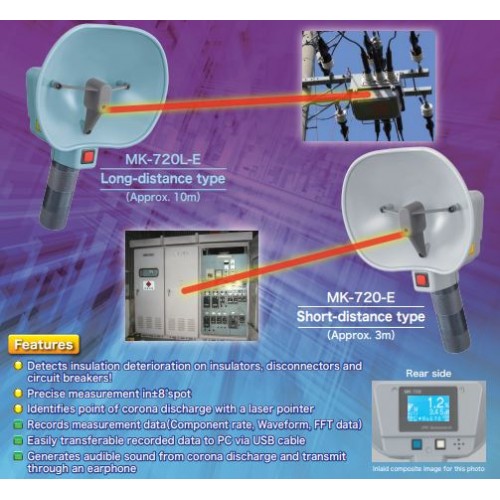 Broadband ultrasound is emitted with corona discharge due to insulation deterioration at AC powered facilities. Since the intensity of the emitted ultrasound varies periodically with alternative voltage, double frequency components of power-supply appears prominently in frequency analysis after envelope detection of the received ultrasonic wave. MK-720 can detect corona discharge without effects of ambient noises by evaluating the intensity of double frequency components of the power-supply.