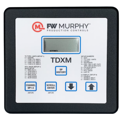 Highly reliable and versatile, the TDXM-DC accepts up to 24 type J or K grounded or ungrounded thermocouples. Each channel has three adjustable set points SP1, SP2 and SP3. The SP1, SP2 and SP3 set points correspond to the SP1, SP2 and SP3 outputs. Additionally it has the selectable feature to monitor and alarm or shut down on deviation from an average for up to two groups of temperatures (GRP/DEV; deviation from average). One group could be exhaust temperatures, and another group could be bearing temperatures.