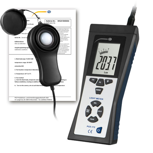 The lux meter provides measurement results in Lux and FootCandle units, where 1 fc is equal to 10.70 lux. Calculator for the conversion of lux. The device automatically detects the peak value if this value lasts for at least 10 μs. Due to the selectable measuring range the lux meter PCE-172 has high accuracy. The handling is very easy. This lux meter can also be used by untrained persons. However, it is always important to take into account in a lux measurement that certain conditions are met. For example, the distance and angle between the lux meter and the object to be measured should be set as accurately as possible in order to achieve reproducible results.